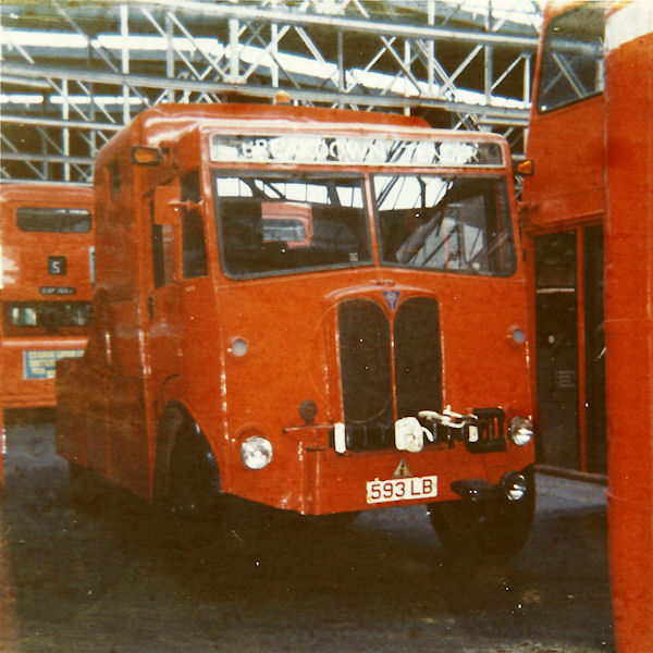 | Details: Three of the eight AEC Matador breakdown tenders acquired in 1947/1948 lasted until the mid-1970s. 747P was photographed inside Poplar Garage on 24th April 1971 keeping company with some early DMS class buses. Note the covered rear wheels. As far as I know, 747P was the only one of the batch to have this feature. | ||||