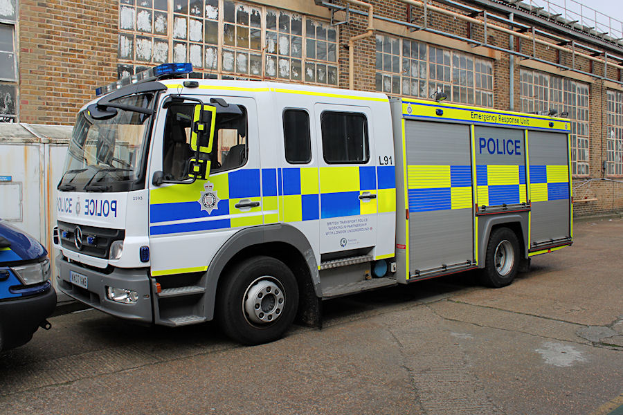 | Details: A notable development over the turn of 2011/2012 was the reliverying of Emergency Response Unit (ERU) 2593 into British Transport Police (BTP) colours. The reasoning is to permit the use of blue lights and two-tone sirens whilst on the way to incidents. There are strict controls over which organisations are permitted to use these, mainly being limited to Police, Fire, Ambulance and a few others (such as MoD bomb disposal). When accidents do occur on the underground, the police sometimes have to await the arrival of the ERU with its specialised knowledge and equipment. The use of blue lights will hopefully reduce response times. Rather than getting the rules changed, the plan is for the ERU vehicles to be driven by BTP officers. Some changes to the livery were expected, but the appearance in full BTP livery was something of a surprise. Note that the vehicle retains its CDS fleetnumbers on the front but also carries BTP number L91. Photographed at Acton Works on 12th January 2012. | ||||