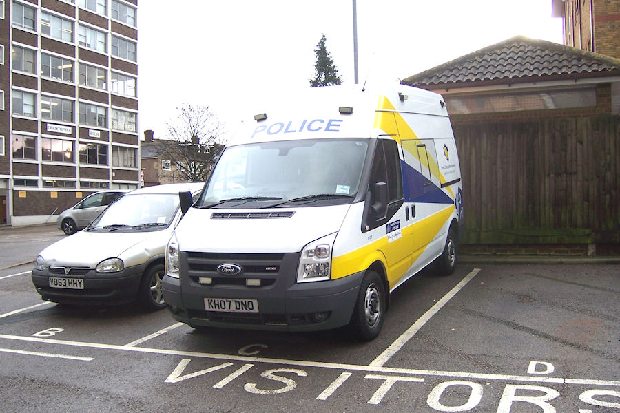 | Details: Another Police-branded service vehicle now, in the form of London Safety Camera Partnership (LSCP) Ford Transit crew van 6121F. Three such vehicles (6120F to 6122F) were given this startling livery in 2007, replacing earlier Vauxhall Vivaro vans 5451V to 5455V. The LSCP also operated Transit van LN08ZDS (given duplicated fleetnumber 6123F) and two Transit exhibition units (5855F and 5909F) but all three were withdrawn or transferred to other roles in 2010. A lack of sightings of the 6120F to 6122F batch suggested that the LSCP operation had been closed down or scaled back, but then 6121F turned up again. We had never known where their vehicles were kept, but Ray found 6121F parked at Marlowe House (close to Sidcup Station) on 16th December 2011 (as pictured). It has been seen there a few times since, suggesting this is its home. Whether the other two remain in use is not known, but neither has been reported since 2009. | ||||