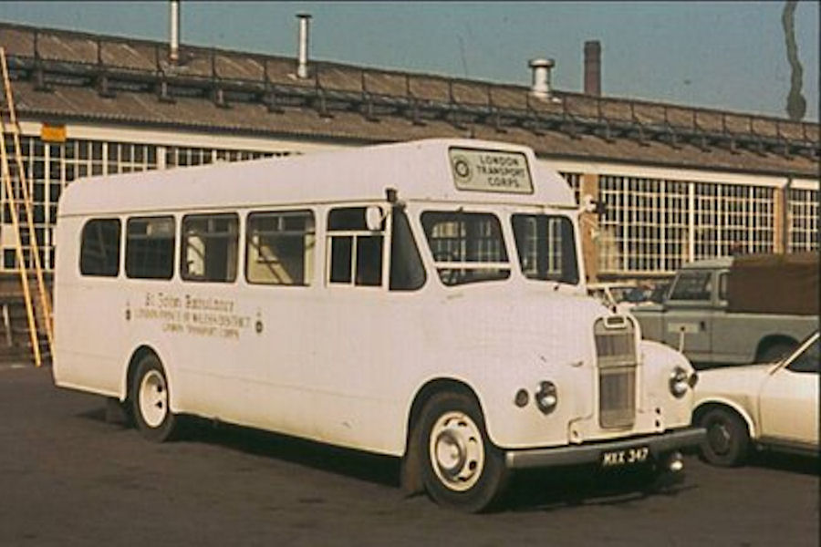 | Details: Another view of MXX347 in the London Transport Corps of the St Johns Ambulance Service, this time at Chiswick Works on 25th March 1974. The Land Rover in the background might be a service vehicle but John does not recall noting its details. | |||