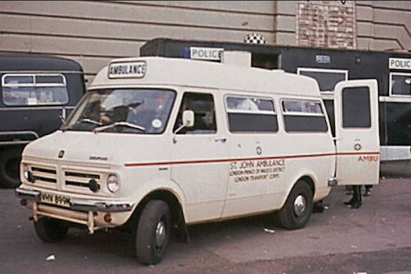 | Details: VHV899M, photographed outside Wembley Stadium on 24th May 1975, was a Bedford CF-based ambulance. As the extensive lettering shows, it was used by the St John Ambulance, London Prince of Wales District, London Transport Corps. In the background are some Police control vehicles in the black livery used at the time. | ||
