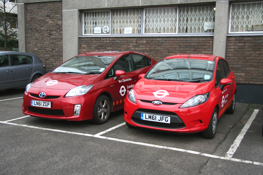 | Details: Getting back to red! Replacements for the LBSL Honda Civic cars arrived in late 2011 in the form of four each of Toyota Prius and Ford Fiesta cars. While the Hondas were maroon, the Toyotas carried a slightly darkened red while the Fords were in almost 'LT' red. LN61ZGP and LM61JFG were photographed at the back of Sycamore House on 4th January 2012. | |||||