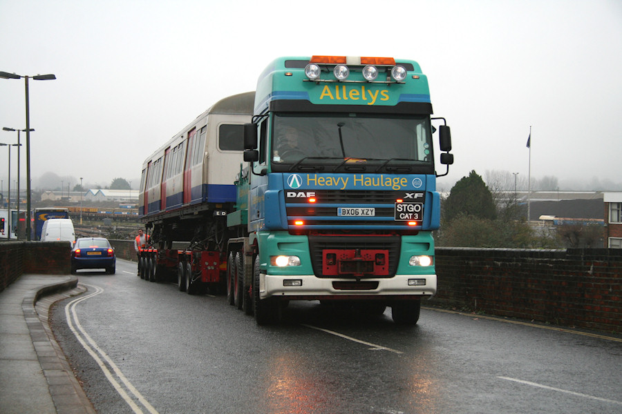 | Details: As well as Blackbushe, Derek visited Eastleigh (near Southampton) on 18th January 2012 and came across the unexpected sight of two London Underground carriages being moved into the railway works there. First up was Metropolitan line car 6226, seen on board Allelys BX06XZY. This DAF XF tractor was photographed at Acton on similar work in 2010. Having squeezed past several trucks on the narrow section of Campbell Road, it was seen preparing to make the tight turn onto the railway bridge. The guy at the back was operating the steering on the trailer. Providing some cross-over to my other website, the railway wagons visible in the background include HQA, JNA, MRA and ZCA ballast carriers. | ||