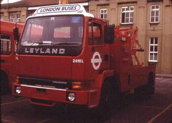 | Details: London Transport bought four Leyland Freighter recovery trucks in 1984, joining two bought in the previous two years. All four originally had Wreckers International twin boom lifting gear, although several were later modified with spectacle hoists. Although listed as being new in late October, this photograph was apparently taken (at Chiswick Works) on 22nd August 1984. 2416L was later allocated to Wood Green garage and passed to Cowie Leaside upon privatisation. | ||||