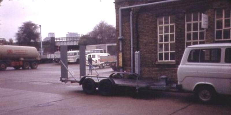 | Details: With John's help we are gradually filling in the gaps in terms of vehicles not previously shown on the website. This photograph taken at Chiswick Works on 4th December 1984 shows newly delivered Scottorn vehicle recovery trailer ST40 parked near the lorry yard. It was hitched to a Ford Transit minibus and both vehicles carried grey livery. The trailer was probably acquired to assist in the recovery of damaged or defective service vehicles, thus avoiding the need to do this! It was repainted to the new blue livery in the early 1990s and lasted until April 1995. | ||||