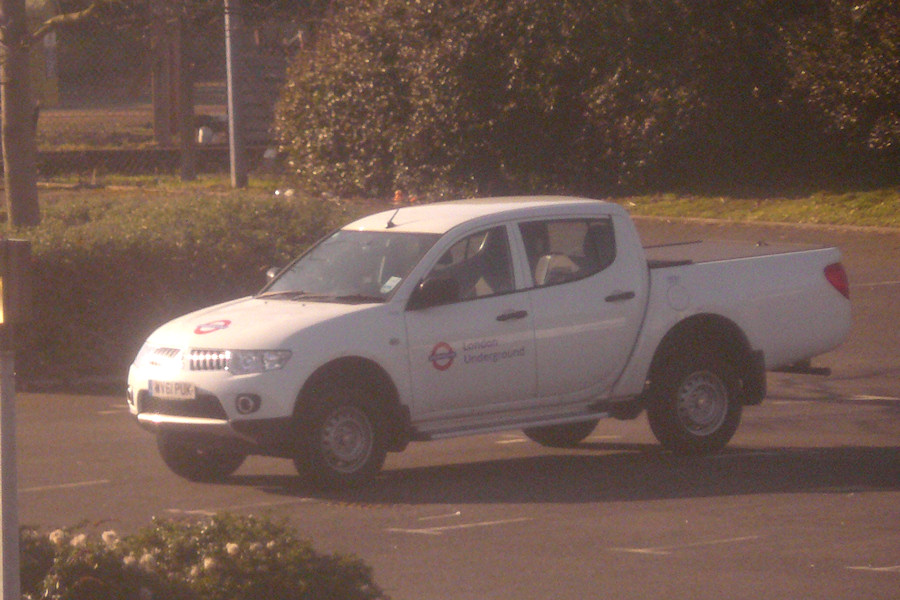 | Details: Photographed in the car park at the north end of Acton Works on 25th February 2012 (with a long zoom, through a dirty window of a moving train, against the sun!) was Mitsubishi L200 pick-up 7318. This vehicle is unusual in several respects. It is the only Mitsubishi to have featured in the leased fleet, it wears a non-standard all-white livery, and it had a very high fleetnumber for its age. It has a crew cab and a flat cover over the load space. The lack of a suffix letter is also unusual. Since the rebranding of vehicles in London Underground livery, several new suffixes have been introduced (C, N, S and SM). M is already in use for Mercedes, while the MAN lorries in the Tube Lines fleet are unsuffixed. MI would have been easily confused with M1, but perhaps MT could have been used. It does make me wonder what is the purpose of continuing with the suffix letters at all. | ||||