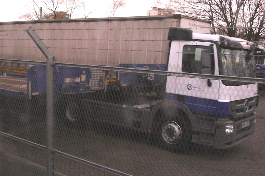 | Details: This is the best shot I could manage of a new lorry that was seen in the yard at Acton Works on 24th February 2012. WP61ZXE is a Mercedes-Benz Actros 2-axle articulated tractor unit. Some new tractors have been expected for some time, to replace the remaining 1998 Actros units, and perhaps also the 2002 Ategos. Note the long wheelbase, the skirted sides, and the 'eye-brows' above the windscreen. A rather more dramatic restyling of the Actros is due to be launched later this year. | ||||