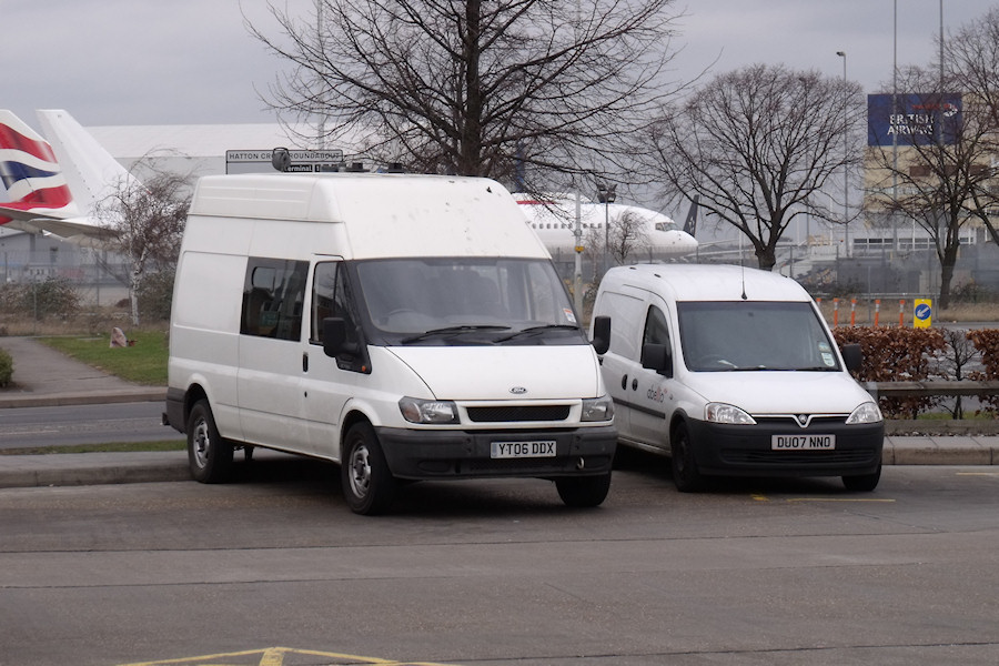 | Details: The following three photographs all show plain white vans at Hatton Cross Bus Station. First up is this view taken on 22nd February 2012. The Mk6 Ford Transit crew van on the left is anonymous but believed to be an Abellio vehicle. It has possibly replaced Mercedes Sprinter T573FFC (which was very often seen parked here) as a crew ferry and rest room. Alongside is Vauxhall Combo DU07NNO. | |||||