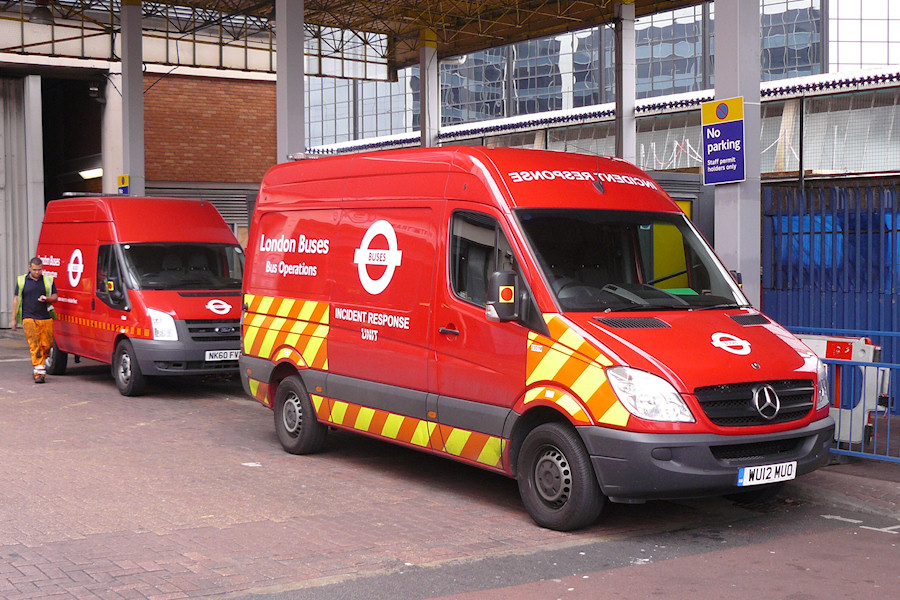 | Details: The latest Incident Response Unit vans for London Buses are being delivered in batches of four in reverse numerical order, with 7290M to 7293M due on the road this week. One of four licensed on 2nd March 2012, 7301M was allocated to Uxbridge Bus Station. It was photographed there on 5th April, parked in front of Infrastructure's electric Ford Transit 7161F. The latter is usually kept here since it is plugged in to an electricity supply mounted on the adjacent column. | |||||