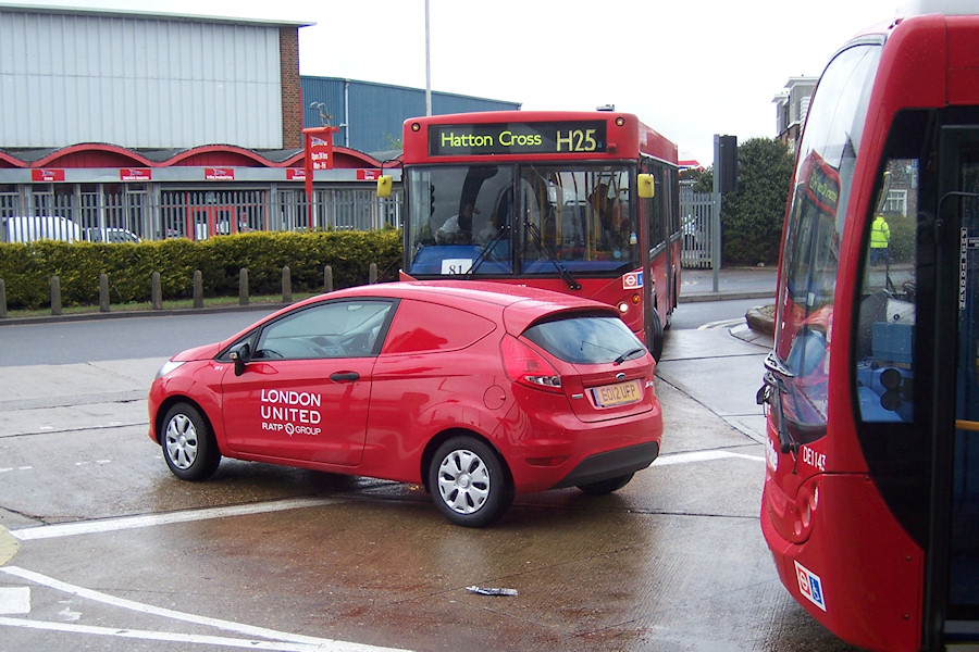 | Details: London United's large batch of Ford Fiesta vans continued to enter service through April 2012. Photographed at Hatton Cross Station on 19th April, EO12UFP carried fleetnumber FF5 and was working from Hounslow Heath Garage. The buses are an Abellio Caetano-bodied Dart on route H25 and a Metroline Enviro 200, presumably doing an odd working on route 90. | ||||
