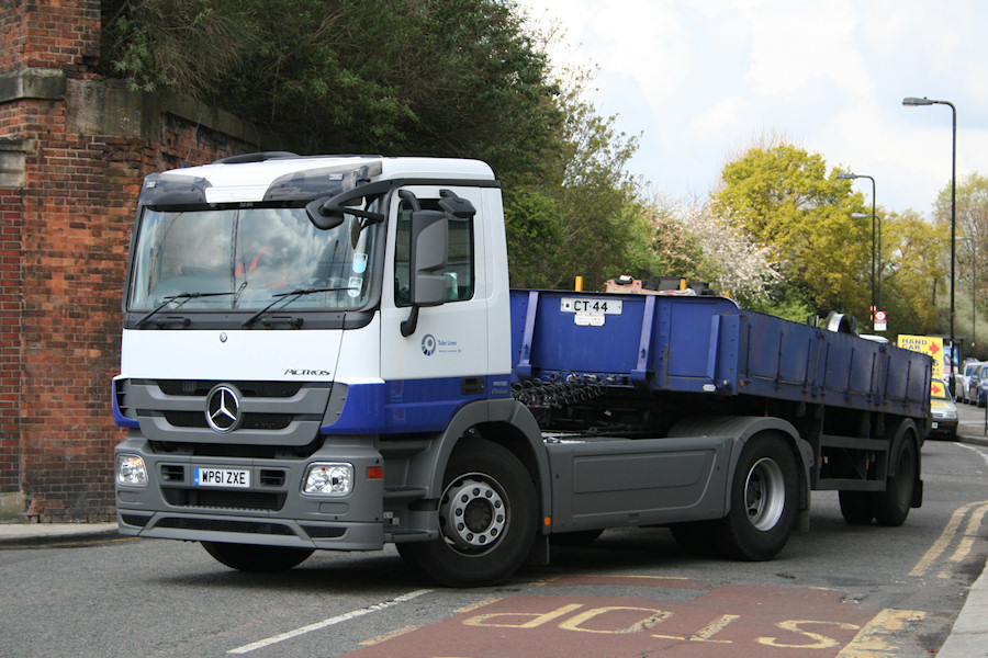 | Details: Although he was soon rained off, Malcolm managed to capture some excellent shots of new vehicles on Bollo Lane on 20th April 2012. Seen entering Acton Works is Mercedes-Benz Actros artic tractor WP61ZXE, new two months earlier. I'm not sure what purpose the 'eye-brows' above the windscreen serve. Trailer CT44 is looking good considering that it is over 21 years old. | ||||