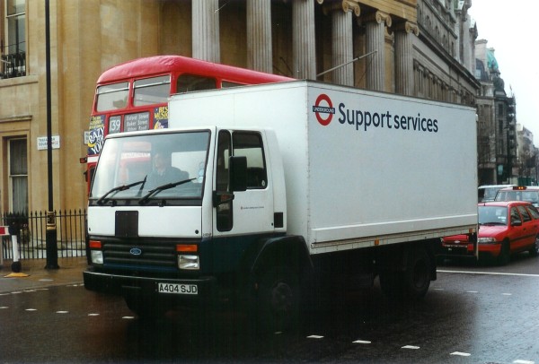 | Details: Four of the 30 Ford Cargo lorries operated by London Transport were box trucks, the first of which was 2404F (A404SJD). New in October 1983, it lasted long enough to be repainted into LUL livery, as seen in this February 1995 view at Trafalgar Square. Note that the fleetnumber has been squeezed into the traditional position on the front corner. On many Ford Cargos, the number was carried on the door or elsewhere. | |||