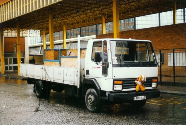 Details: By the time Ford replaced the D-series with the Cargo, London Transport had moved to a policy of multi-sourcing for its service vehicle fleet. As a result, in the 8 years from 1982 to 1990, just 30 Ford Cargos were bought, compared to over 100 Ford D-series lorries in the years 1970 to 1978. 2408F (A408SJD) was part of the second large batch, being delivered in October 1983 and lasting around 7 years. It was photographed at Uxbridge bus garage on 2nd March 1989 loaded with engineering crates, and a teddy bear! A red-backed London Buses sticker has been applied to the cab door.