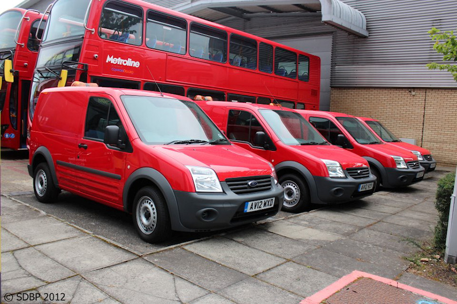 | Details: These four brand new Ford Transit Connect vans were parked outside Metroline's CELF works in Perivale over the Jubilee weekend. Several people sent in photographs, but this was the only one to show all four. Although unmarked, the location (plus the light bars) makes it likely that these will be a new generation of engineering support vans for Metroline. It has been suggested that Transport for London might now be specifying red livery for vehicles involved in bus-related work. It does seem to be becoming more prevalent. Also present were several VW class buses, destined for Holloway Garage. | ||||