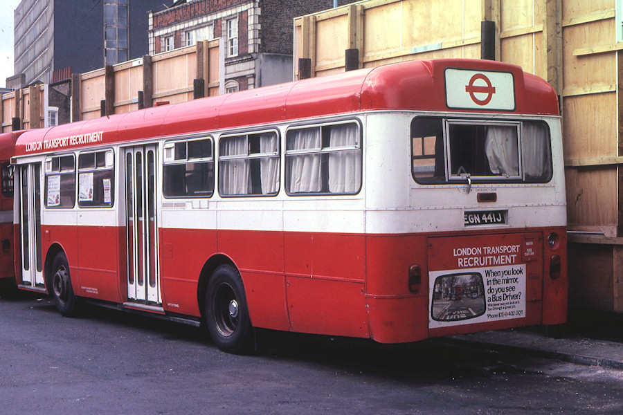 | Details: Kim has recently sent in some beautifully high-resolution scans of slides taken in the 1970s and 1980s. The first of these shows (for the first time here) AEC Swift bus SMD441 parked at Victoria Bus Garage. Five redundant AEC Swift buses were converted for other roles between 1978 and 1981. SMD441 became a mobile recruitment bus in May 1979 and was repainted in this attractive red and white livery. It also later carried the spurious fleetnumber 441R. Eventually sold in March 1987, it was outlived only by mobile classroom STB91. Another AEC saloon is just visible parked in front, but this may be one of the buses based here for Red Arrow services until replaced by Leyland Nationals in 1981. | ||||