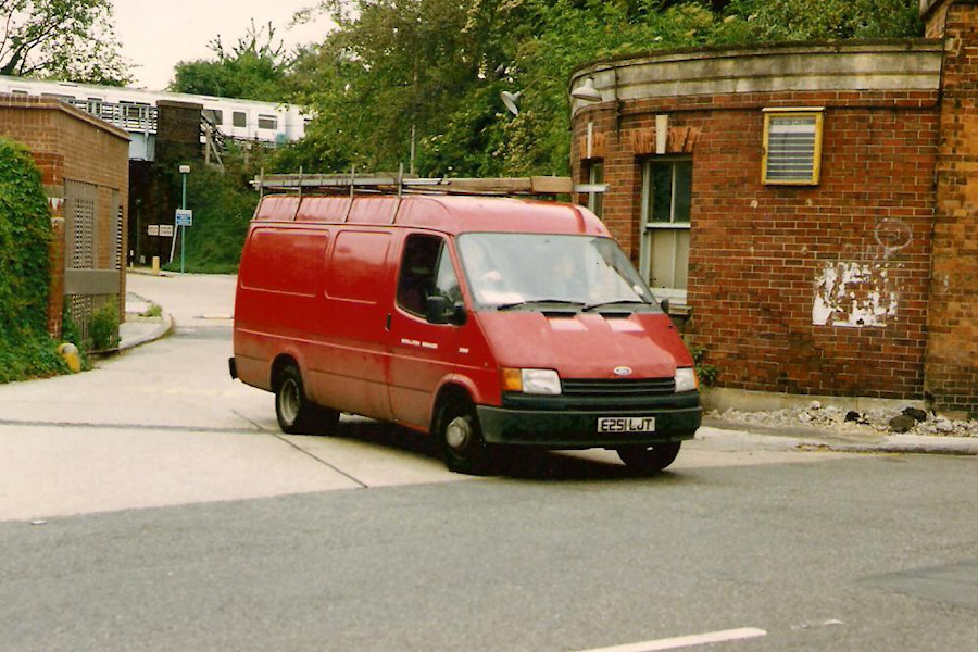 | Details: Photographed emerging from Acton Works on 11th June 1990, 3494F was a LWB petrol Ford Transit Mk3 van new in autumn 1987. It was unmarked apart from fleetnumbers and 'Installation Manager' lettering on the doors. Something I had not noticed before is that the switch from grey to red livery on LT's Ford Transit vans seems to have happened with the change from the Mk2 model to the Mk3. Could it be that grey was not an option on the Mk3? | ||||