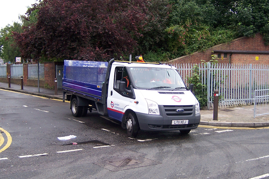| Details: Delivered in April 2011, Ford Transit dropside truck 7035F was not seen in daylight until Ray caught it leaving Hainault depot on 9th July 2012. As can be seen, it has a tail-lift but no crew-cab. There also appears to be a small crane or hoist behind the cab. | |||