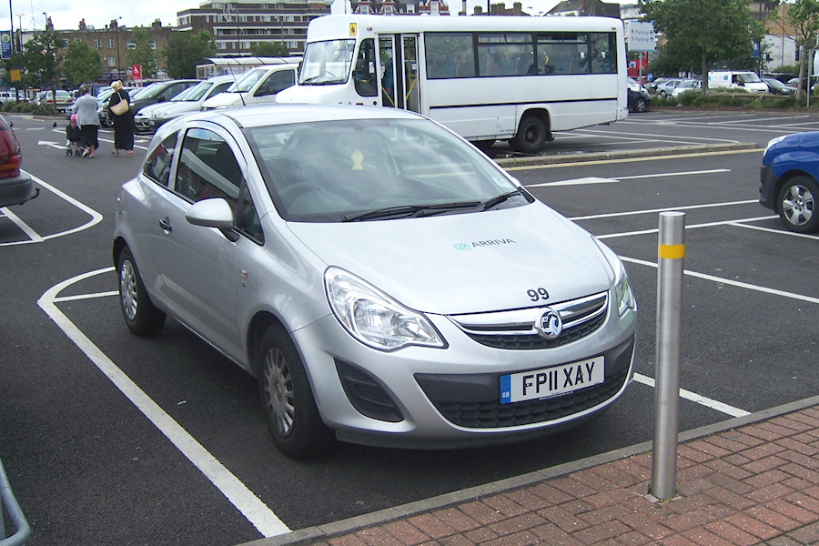 | Details: Arriva London's Vauxhall Corsa crew ferry cars do seem to be rather prone to reallocation, due to both route changes and attempts to balance the mileages. Photographed in the car park of Tesco on the Old Kent Road on 13th July 2012, car number 99 (FP11XAY) was evidently working from Ash Grove, whose route 168 has crew changes nearby. This car and similar 98 FG11XZZ (which was also present), both started out at Lea Valley garage (LV) before moving to Barking (DX) then on to Ash Grove (AE). By the way, all but the last 7 of the 1st generation of Corsa cars have now been withdrawn (fleetnumbers 92 to 136). 32 of these numbers have been reused on 2nd generation cars, with 13 not yet seen. It may be that route tendering losses have reduced the requirement and that the remaining numbers (112-120, 122, 125, 130 and 136) will not reappear. | |||