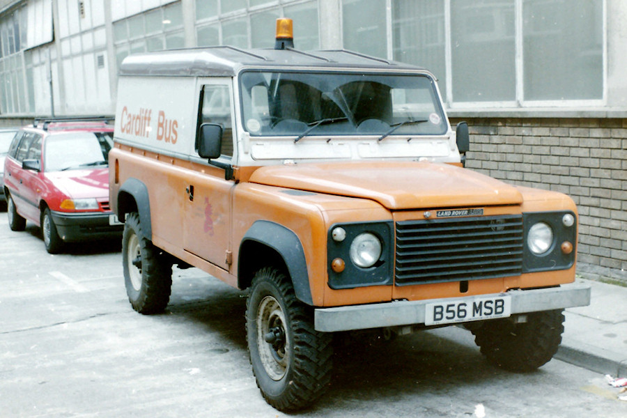 | Details: Cardiff Bus has featured on this site before, but here is their Land Rover Defender van B56MSB, photographed at the garage on 30th April 1995. Although it looks rather rugged, Richard commented that it wouldn't 'pull the skin off a rice pudding'! | ||