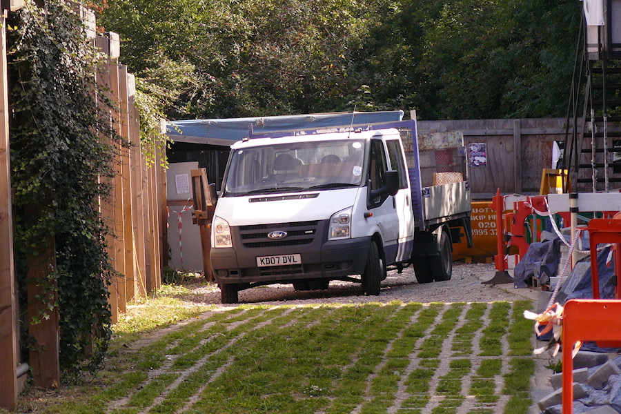 | Details: I have to thank Derek Everson for this photo. He told me several times that he had seen 6208F in a yard at Hounslow East Station. However, it was never there when I passed. It turned out I was looking in the wrong place. There is a permanent yard on the south side of the station (with a large power supply building in it). But, there is now also a yard on the north side, built on part of a small park and presumably temporary. Ironically, I first saw 6208F at Colindale, in a temporary yard built on part of a park (since returned to its original condition). New in June 2007, 6208F has recently lost all its lettering (at least on the nearside) and seems to also have a replacement drop-side door in grey (rather than blue). Photographed on 11th August 2012. | ||||