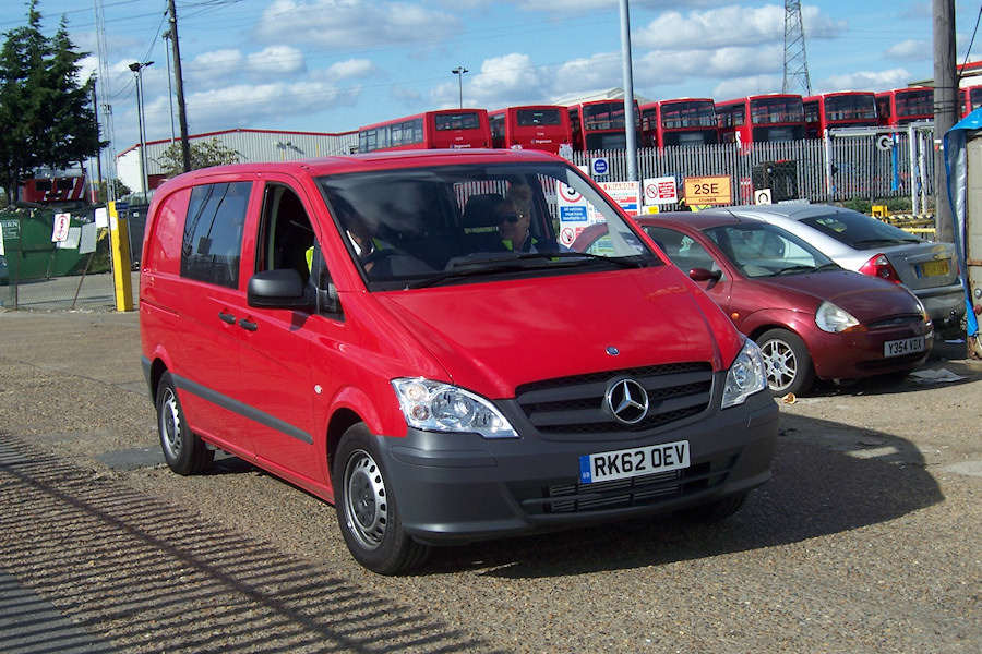 | Details: Go-Ahead London took delivery of a batch of new Mercedes-Benz Vito crew vans in September 2012. Five had been reported by the end of the month, all operating in anonymous red from the Blue Triangle garage at Rainham. RK62OEV was photographed leaving the garage on 22nd September. A look at the licensing details suggests there may be a few more yet to be seen, perhaps at the Silvertown base. The buses visible in the background are Stagecoach Dennis Tridents stored in their adjoining garage, while a maroon and silver striped open-top Fleetline is just visible to the left, this being parked in the Arriva Tour yard. | ||||