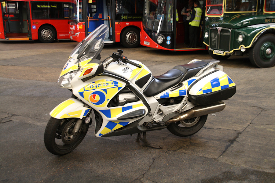 | Details: A surprise sight at the Leyton Garage open day held on 22nd September 2012 was this Honda ST1300 motorcycle resplendent in high-visibility livery with Stagecoach fleetnames and logos. In the background can be seen some of the excellent selection of buses on display, including three class pioneers in the shape of TA1 (the first Stagecoach Dennis Trident), 15001 (their first Scania) and LT1 (the first New Bus for London), plus Shillibeer-liveried Routemaster RM2208. | ||||