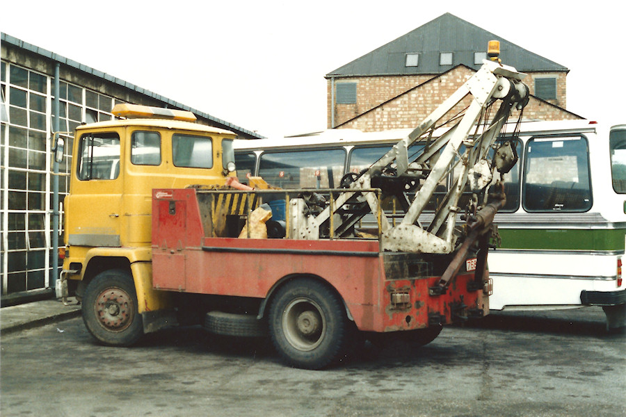 | Details: The last use of the M-prefix number series by LCBS was M4, an AEC Marathon recovery truck acquired second-hand in 1982. It had a yellow cab with red bodywork and does not appear to have gained any company lettering. Being based at Hertford it passed to London Country North East in 1986. On 21st June 1987 it was photographed at its home garage in company with a Duple-bodied coach, most likely one of the two DLs acquired in 1980. | |||||
