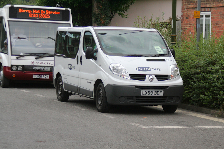 | Details: The two newest Renault Trafic minibuses in the Metrobus fleet have always been based at Crawley and are thus less often seen and photographed than their London-based sisters. Derek found 8043 (LX59BCF) at Horsham bus station on 23rd August 2012, parked in front of a Compass Bus Optare Solo. | |||