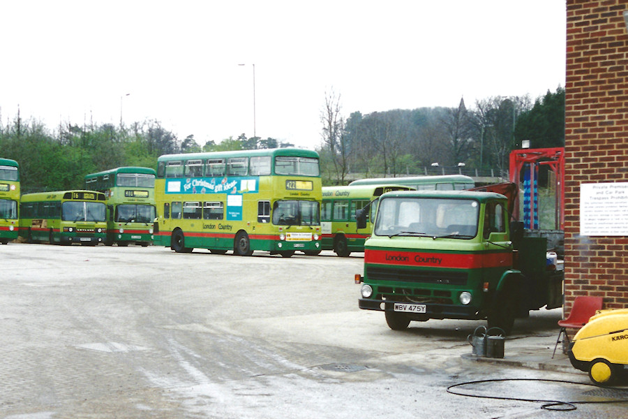| Details: This photograph was taken at London and Country's Merstham Garage on 19th April 1996, a few days after the location had opened as a replacement for Reigate Garage. To the fore is Leyland Terrier dropside lorry WBV475Y. This was acquired second-hand in about 1988 and initially ran in plain green with London Country South West fleetnames. As can be seen, it later gained the two-tone green and red livery as used on the bus fleet. Note the fleetnumber A1 above the door handles and that a crane is fitted behind the cab. The buses in the background are mainly former LCBS AN and SNB vehicles, but there is also a Leyland National 2 (a type never operated by LCBS), and preserved RMC4 is just visible at the back. Merstham Garage only lasted until 2001, when Arriva pulled out of the area. Metrobus took over most of the services. | |||