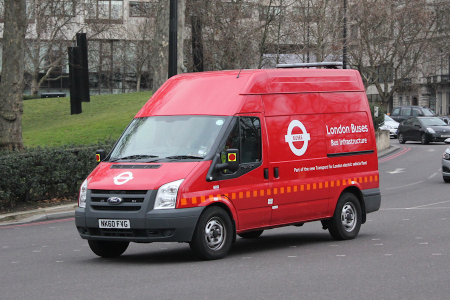 | Details: Apart from the additional side lettering, the four Smith Edison electric Ford Transit vans used by London Buses Infrastructure are virtually indistinguishable from the normal diesel versions. Two of the four are based at Victoria Coach Station and are somewhat hard to see. They are presumably kept (and recharged) in the basement car park there. Colin caught 7162F rounding Hyde Park Corner on 21st December 2012. LBSL Infrastructure has a fleet of 18 VW Transporter vans new in 2009/2010 which are probably coming up for replacement soon. It will be interesting to see whether the replacements include any more 'green' vehicles. | |||