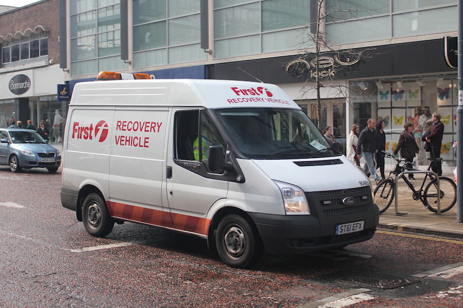 | Details: Not a trace of pink or purple on this First service vehicle, although it leaves no doubts as to its role. Carrying national fleetnumber 90485, short-wheelbase mid-height Ford Transit van ST61EFX is (despite the Scottish registration) based in Norwich. It was photographed on 20th April 2012. | ||