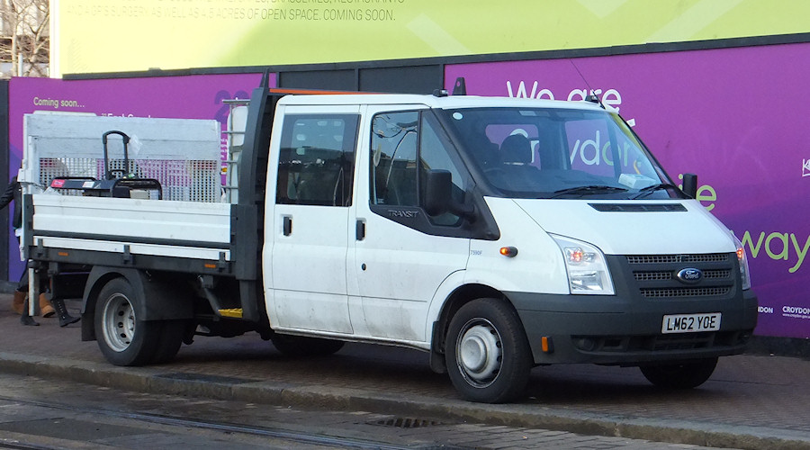 | Details: Vehicles in the number range 7576 to 7591 have (so far) all been in unmarked white livery. One of them is Ford Transit dropside truck 7590F, photographed at East Croydon on 4th March 2013. As the location would suggest, this vehicle is working for Tramlink, and it carries a water tank in the back for use in connection with track cleaning. Unmarked Renault Master dropside 6645 latterly performed the same role. | |||