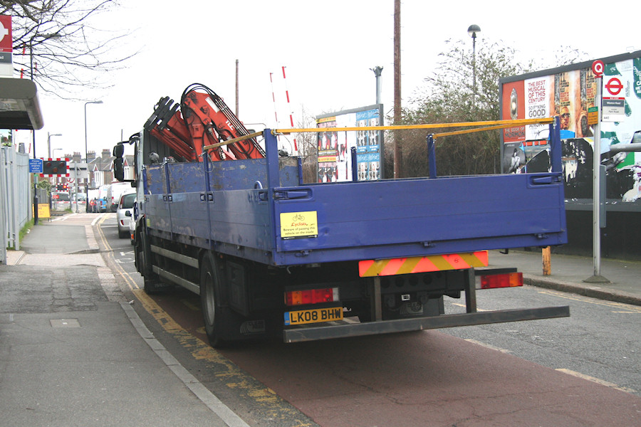 | Details: Photographed waiting for the level crossings on Bollo Lane on 6th March 2013, LK08BHW is an Iveco Stralis dropside lorry new in 2008. This rear view shows the extended stanchions fitted recently together with the protective bars. These are intended as a safety feature for staff working on the vehicles. | |||