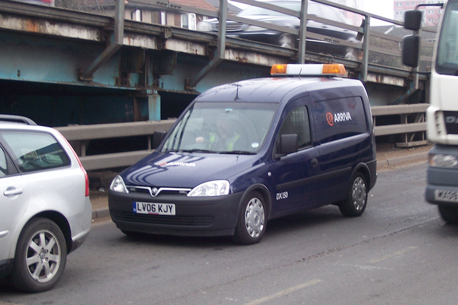 | Details: Vauxhall Combo van LV06KJY has been with Arriva London for a few years, perhaps from new, and has been noted at Wandsworth and Wood Green garages. However, it initially operated in unmarked navy blue. It later gained a light-bar and Arriva lettering and transferred to the Dagenham/Barking garage, perhaps as a replacement for the Land Rovers latterly based there. The curious fleetnumber of DX150 was perhaps chosen to follow on from the large batch of Vauxhall Corsa cars (which got as high as 145). It was photographed passing the flyover near to its home garage on 20th March 2013. | |||