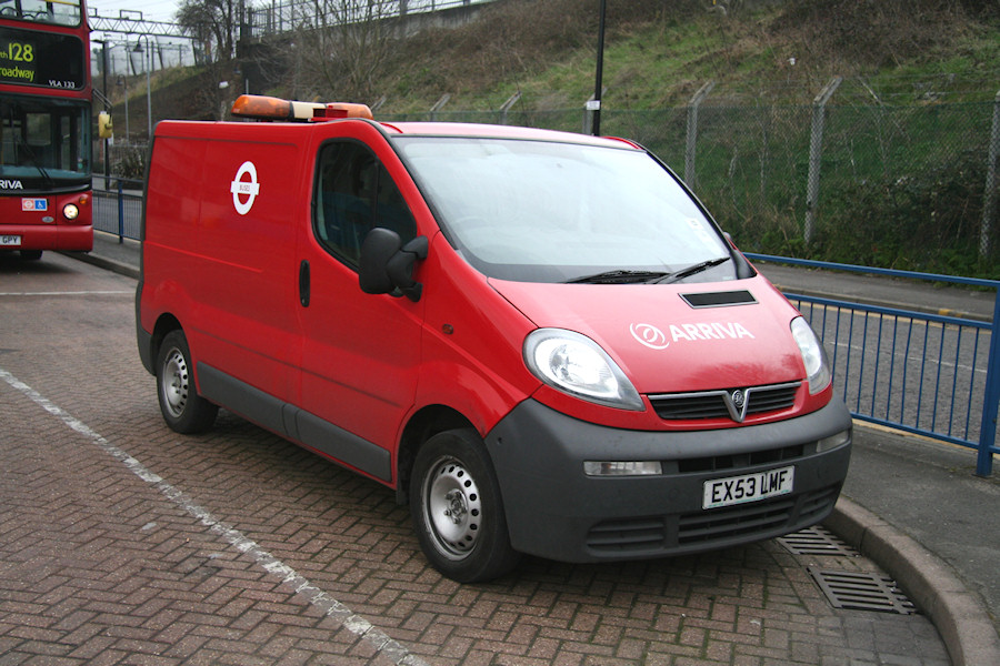 | Details: Vauxhall Vivaro van EX53LMF has been at Arriva Southern Counties' Grays garage since at least 2008, possibly since new in 2003. In spring 2013 it was repainted from white to red livery, with Buses roundels on the sides and an Arriva name across the front (the back is in plain red). It was photographed at Romford Station on 20th March 2013. | |||