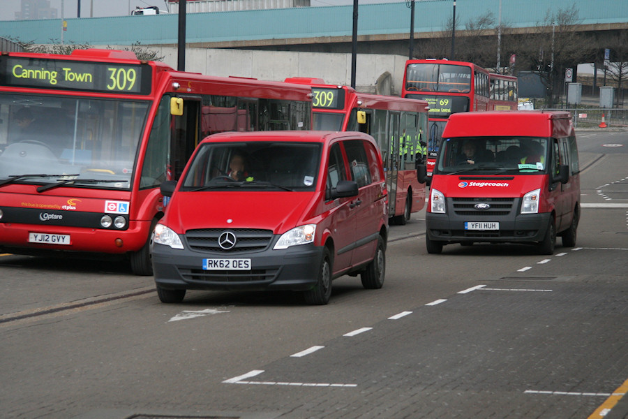 Details: Two for the price of one at Canning Town Bus Station on 20th March 2013. Go-Ahead London's unmarked Mercedes-Benz Vito crew van RK62OES leads Stagecoach Ford Transit minibus YF11HUH past two of the CT Plus dual-door Optare Solo buses.