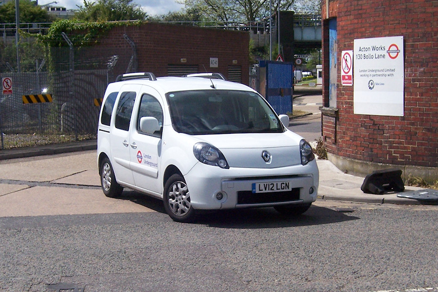 | Details: Among the large number of Renault Kangoos added to the leased fleet in 2012, only a couple are what you might call 'non-standard'. 7343R was a Kangoo Estate new in May that initially operated in unmarked white. It gained LUL lettering about a year later (as seen when leaving Acton Works on 16th May 2013), but still lacked fleetnumbers and the blue/red skirting. | ||||