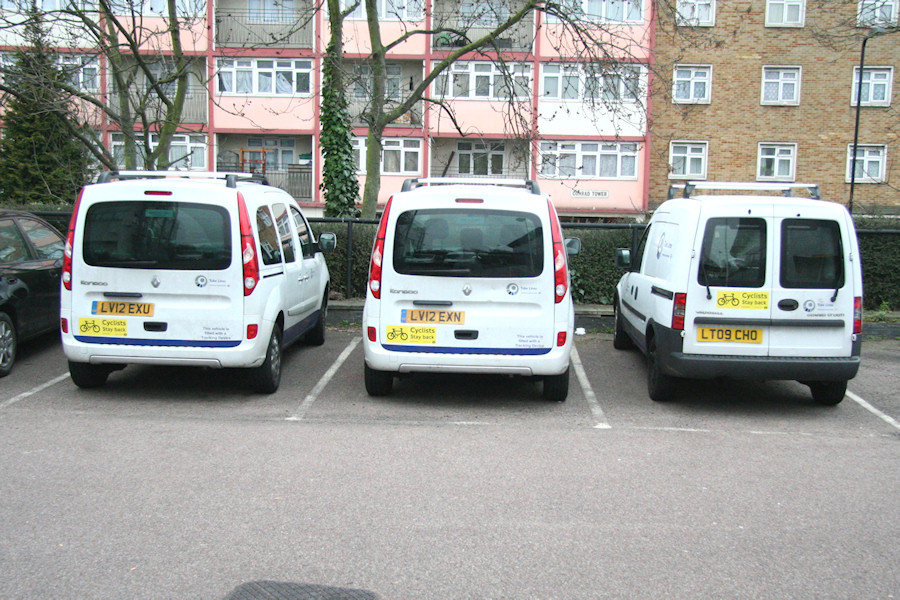 | Details: A rare view of the yard at Bollo House in Acton on 17th April 2013 with a trio of service vehicles on display. As I have mentioned before, the pavement on Bollo Lane passes within a few feet of vehicles parked here but the height difference and bushes makes them all but invisible. On the left are Renault Kangoo Estates 7382R and 7384R while on the right is Vauxhall Combo van 6663V. All are in Tube Lines white/blue livery and all sport the rear cyclists notices that have multiplied over the past year. | ||||||