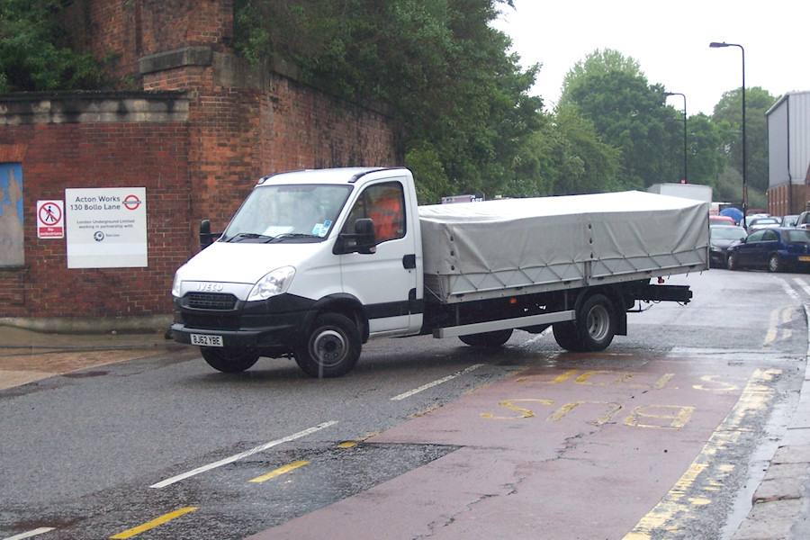 | Details: This Iveco Daily dropside truck has been seen at Acton Works on numerous occasions recently. It carries no lettering or labels, but always seems to have a tarpaulin neatly secured over its load-space. Ray did well to catch this view of it arriving back at the works in some miserable weather on 28th May 2013. | |||