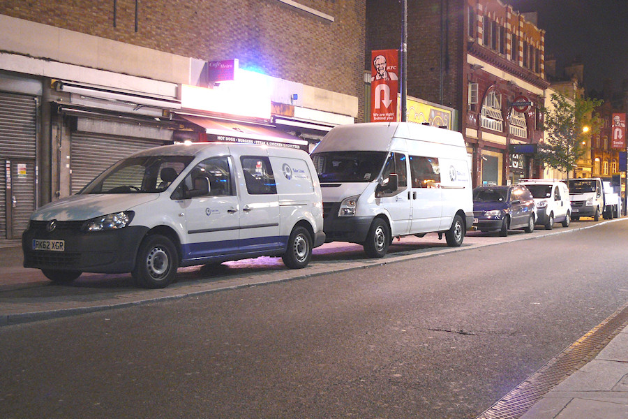 | Details: Several Tube Lines liveried service vehicles were found parked around Camden Town Station in the early hours of 8th August 2013. This line up was headed by Edgware-based Volkswagen Caddy Maxi crew van 7547VW, behind which was all-white Ford Transit facilities van 7431F. Apart from a Peugeot Bipper van, the other vehicles visible are either unmarked or belong to contractors. | ||||