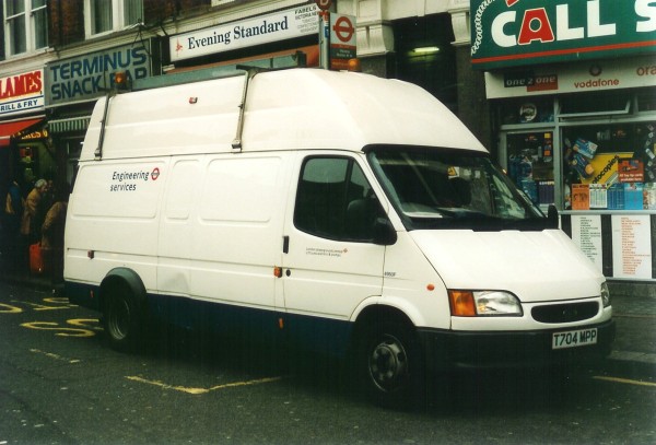 | Details: Ford Transit vans have for some time been available in three different heights, as well as a variety of lengths. The tallest and longest vans are known as jumbos and here is an example of a Mark 5 Transit Jumbo. 4950F (T704MPP) delivered in 1999 was lettered for London Underground, Lifts Escalators and Pumps. The extra length is evident by the short centre panel, while the height has necessitated the use of extended supports for the roof bars. A thin metal box is mounted on the roof, together with flashing lights, and the vehicle also has non-standard, flared rear wheelarches. Photographed at Victoria station on 27th March 2001. | |||