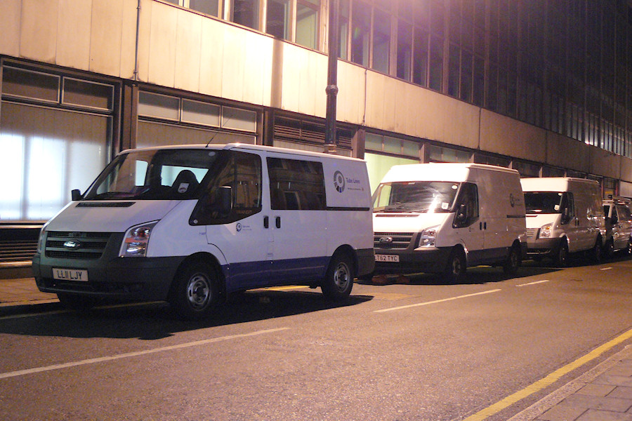 | Details: As usual, several service vehicles were parked near to Green Park Station on the night of 13th/14th August 2013. This line-up of three Ford Transits was found on Bolton Street and was headed by short wheelbase low-roof crew van 7190F and mid-height van 7528F. Although the latter was originally listed here as being short wheelbase, the upper position of the gutter rail shows it is actually medium wheelbase. Both are from the Tube Lines Lifts and Escalators fleet, nominally based at Frank Pick House in Acton. At the rear is long wheelbase mid-height van 7584F in unmarked white. | ||||