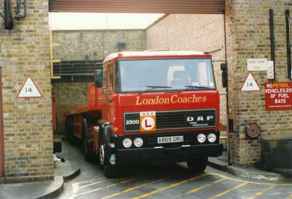 | Details: London Coaches was one of the first offshoots from London Buses, and operated commuter coaches as well as the round London sight-seeing tour. To train its drivers, a pair of DAF articulated lorries were acquired in 1989/1990 and painted in the smart red livery with gold lettering. DAF 2500 A869GRU was photographed at Wandsworth garage on 9th April 1989, and was later given the fleetnumber DT1. Driver training has more recently been performed by a Volvo/Duple coach in Arriva livery. | ||||