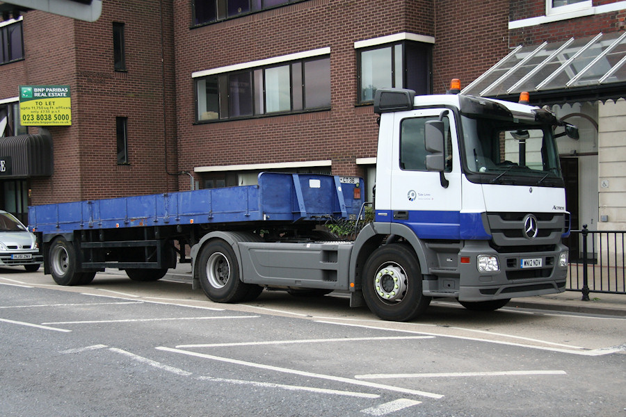 | Details: Having deposited its load of wheelsets at Eastleigh Works, Mercedes-Benz Actros artic WN12NDV was seen heading back through the Hampshire town on 14th August 2013. This tractor unit has a very long wheelbase and looks to be almost as long as its trailer, CT36 dating back to 1984. | ||||