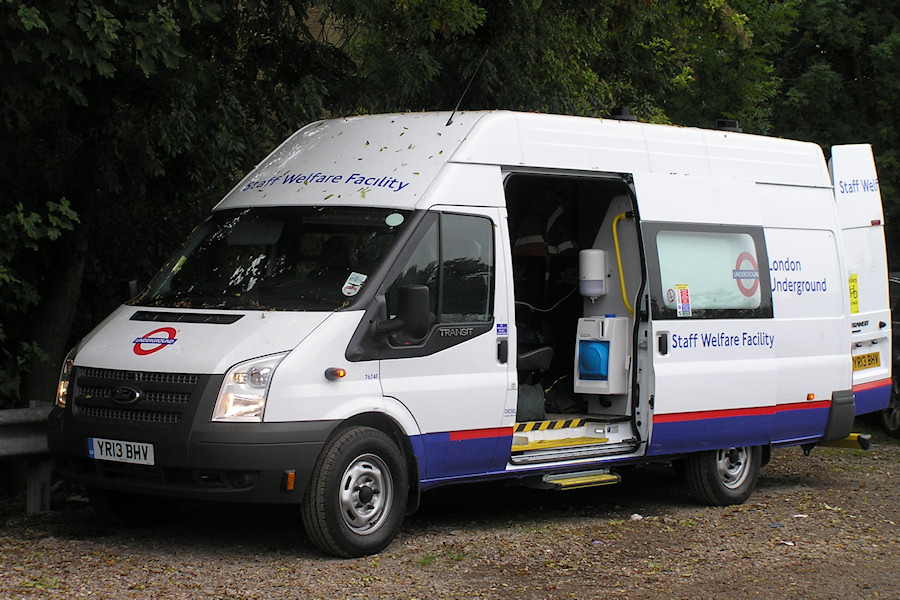 | Details: Fifteen Ford Transit Staff Welfare Facilities vans were added to the central fleet between 2007 and 2009 and these were obviously overdue due for replacement by mid-2013. Apart from a few un-numbered Mercedes-Benz Sprinter vans that arrived early in the year, the first new vans came in September and comprised six Ford Transits numbered 7673-7678F. As with earlier versions, these vans were registered in Yorkshire, suggesting the conversions were done by Clarkes of Doncaster. James photographed 7674F at Northwood Station on 4th October 2013 (during work to remove redundant underground trains). The new vans wear LUL livery (note the incomplete red stripe on this example) with prominent lettering. | |||