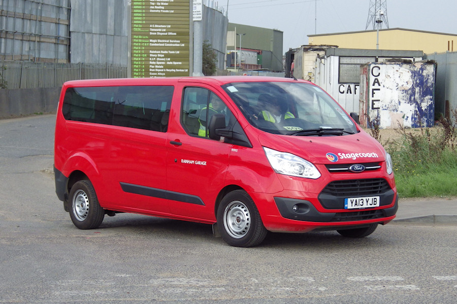 | Details: Ford introduced the new Transit Custom model during 2012 and it is already becoming a common sight on Britain's roads. Intended as a replacement for the smaller Mk.7 Ford Transit vans and minibuses, it will be joined by a new larger Transit (Mk.8) in late 2013. The first of these distinctive vehicles to be reported as service vehicles was a batch of minibuses acquired by Stagecoach London for use as crew ferry vehicles from Rainham garage. These carry national fleetnumbers in the range 90898 to 90903. 90902 was caught leaving the garage on 28th September 2013. The Stagecoach operation here had recently expanded in connection with the withdrawal of First from London bus work. | ||||