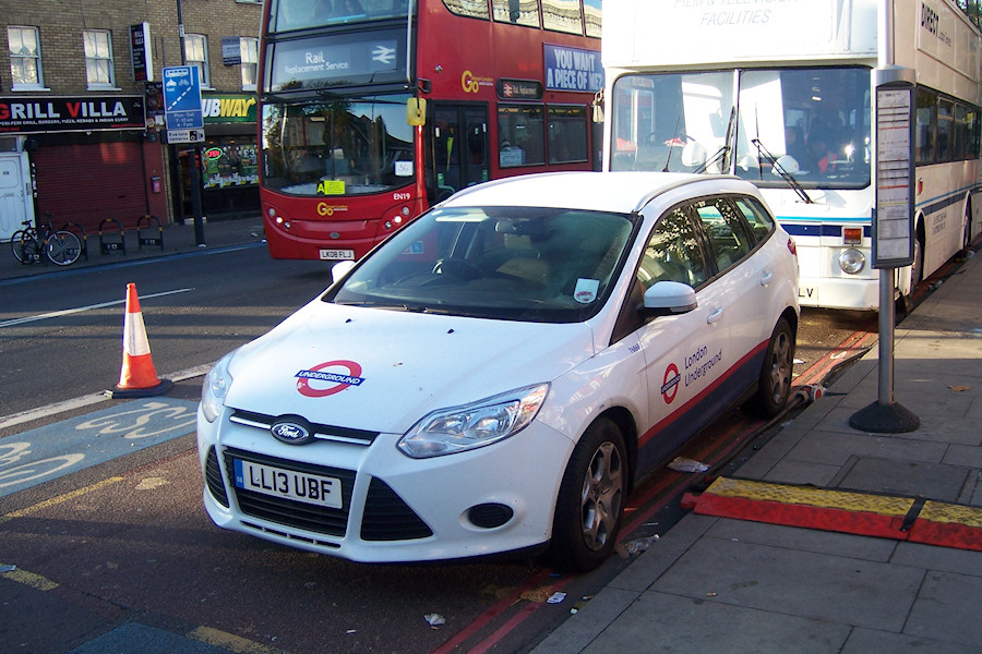 | Details: The District Line was suspended in east London on 23rd November 2013 for planned engineering work. Ray found Ford Focus estate car 7686F parked at Stepney Green Station. The white bus behind is a former Merseybus MCW Metrobus converted into a dining bus and more normally used for film and TV work. | |||