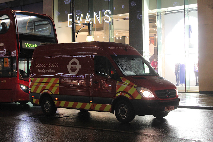 | Details: Mercedes-Benz Sprinter Incident Response Unit 7302M is a common sight around central London, working from its base at Victoria. During a visit to London on 13th December 2013, Colin managed to photograph it 5 times at a variety of locations. This photo was the most impressive, having been taken on Oxford Street very early in the morning using a 1/60th of a second exposure. | |||
