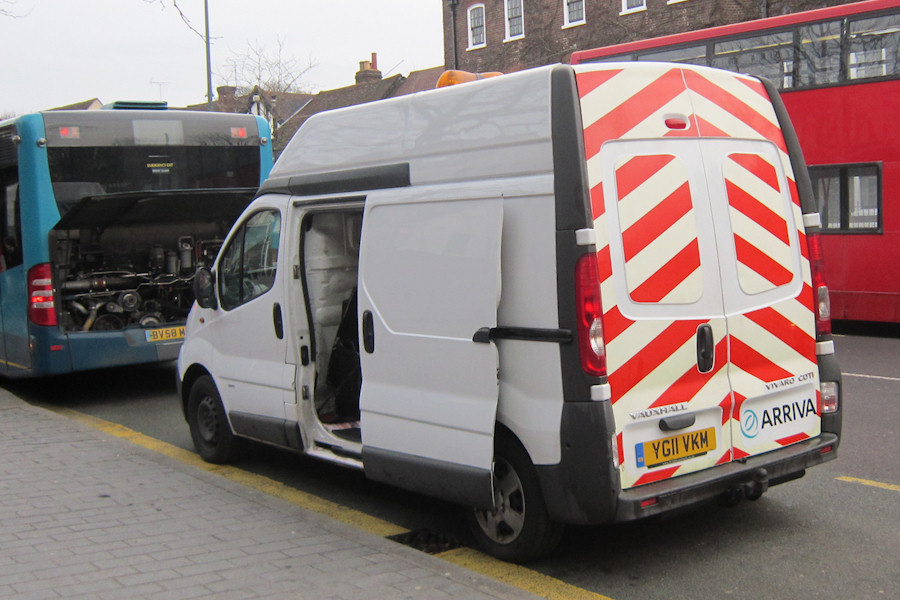 | Details: Vauxhall Vivaro van YG11VKM is based at Arriva the Shires' Garston garage and thus can be seen both in London and in the mysterious lands beyond where all the buses are the wrong colour. On 24th January 2014 it was found in St Peter's Street in St Albans, attending to a defective Mercedes-Benz Citaro bus. The van has high-roof bodywork, minimal lettering and does not appear to carry its allocated fleetnumber of V202. | |||