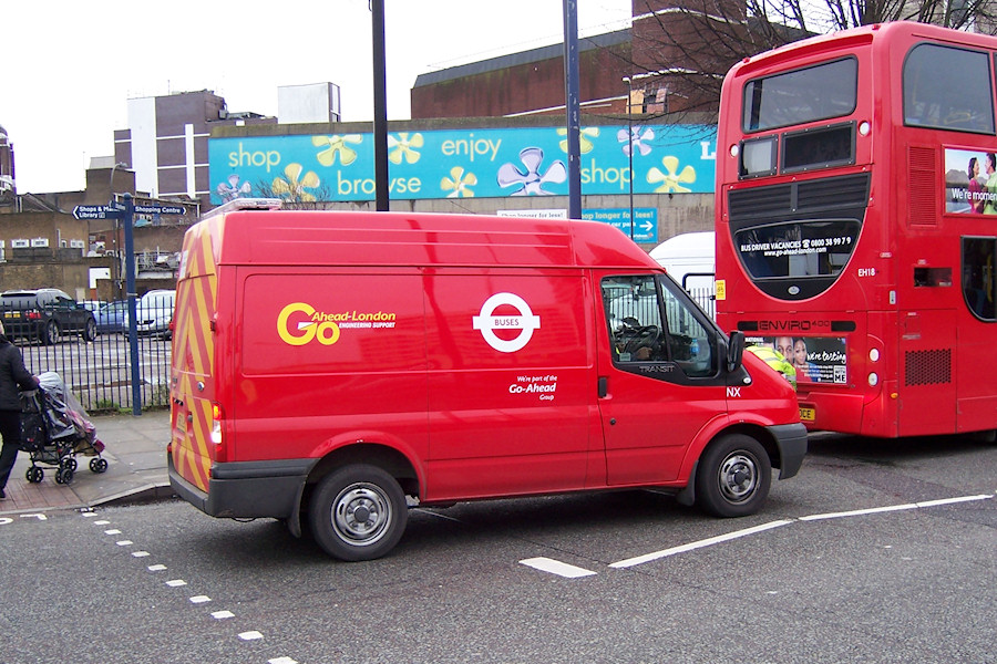| Details: New Cross Garage's Ford Transit van EK13LLP was delivered in plain red in May 2013 but had gained a full complement of lettering by 24th January 2014. On that date it was found on Molesworth Street in Lewisham, attending to one of the Enviro 400 hybrid buses. Regular visitors to this site will be able to identify the two features of this van that show it is a short-wheelbase version. | |||